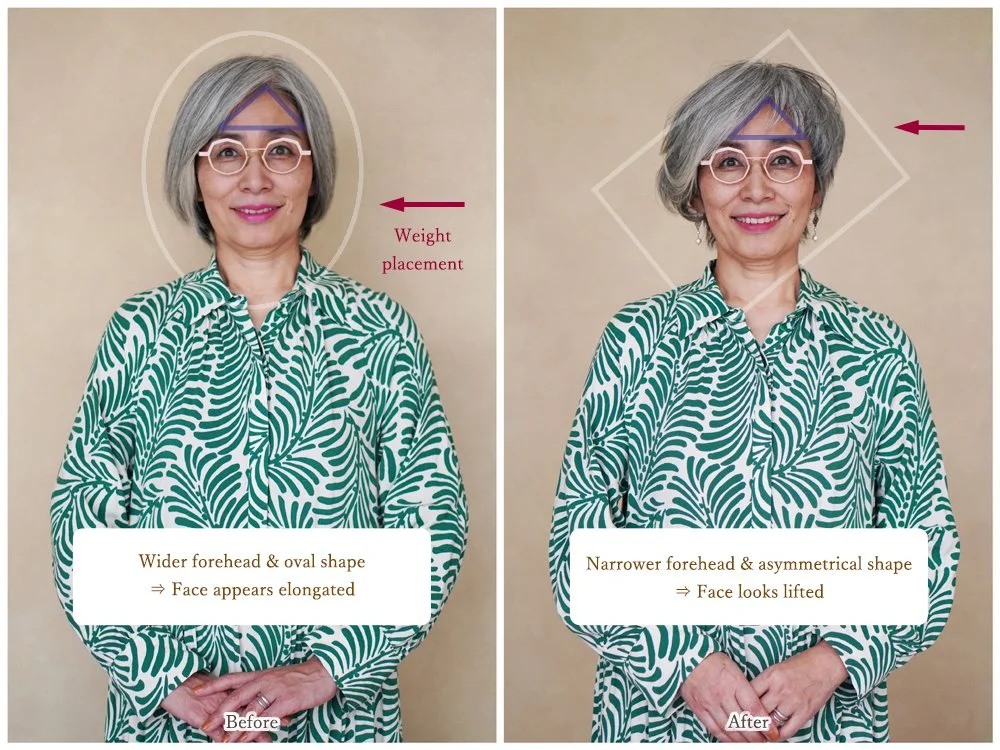 First, I created a diamond-shaped silhouette to soften and visually balance her cheekbones and jawline. This contouring technique enhances facial structure while adding height at the crown and roundness at the back of the head. The result is a subtle lifting effect that counters the natural downward shift of facial and body lines that comes with age.