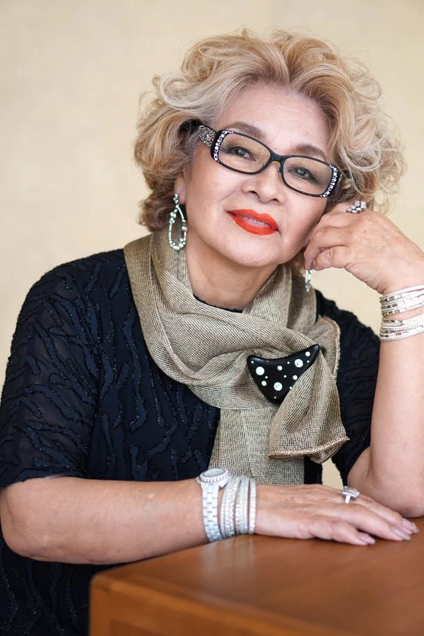 2024年に白髪染めを止め、ファッションカラーでブロンドヘアに。金髪のあでやかなカラーが嶋脇さんの存在感を一層引き立てます。